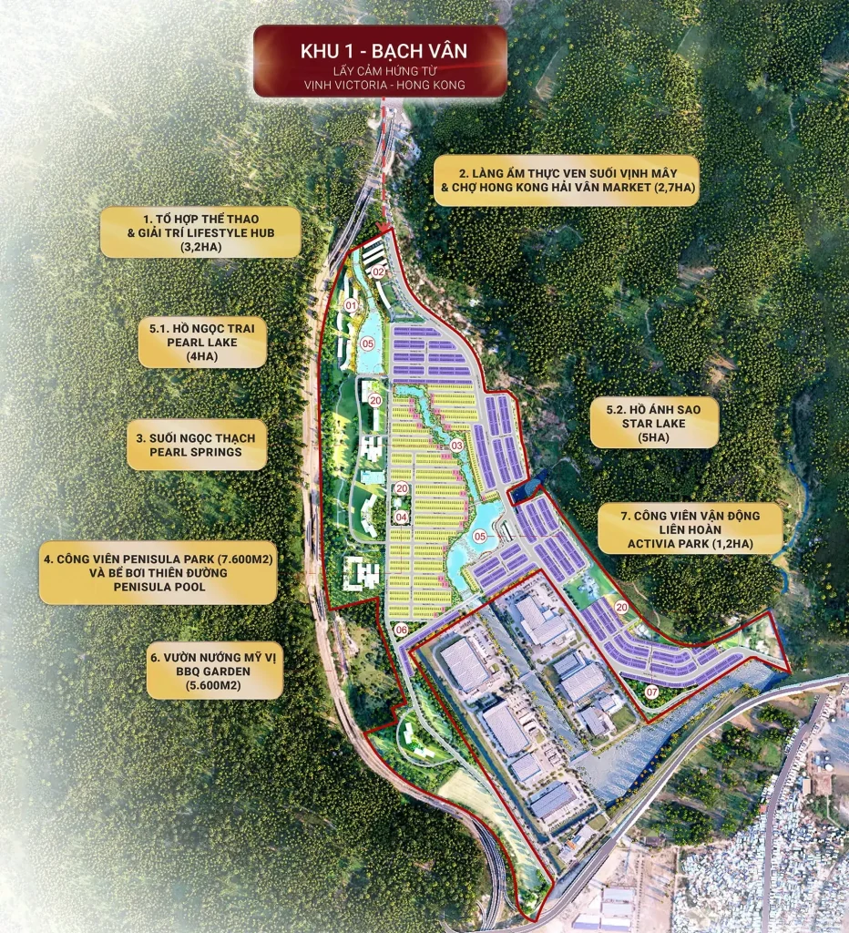 Phân khu Bạch Vân được định vị là “trái tim giao thương” của dự án, nằm tại cửa ngõ Tây Nam và kết nối trực tiếp với trục đường đi cảng Liên Chiểu và Quốc lộ 1A. Kiến trúc mang phong cách Hong Kong, nổi bật với các tuyến phố thương mại sôi động và hệ thống ánh sáng đặc trưng.